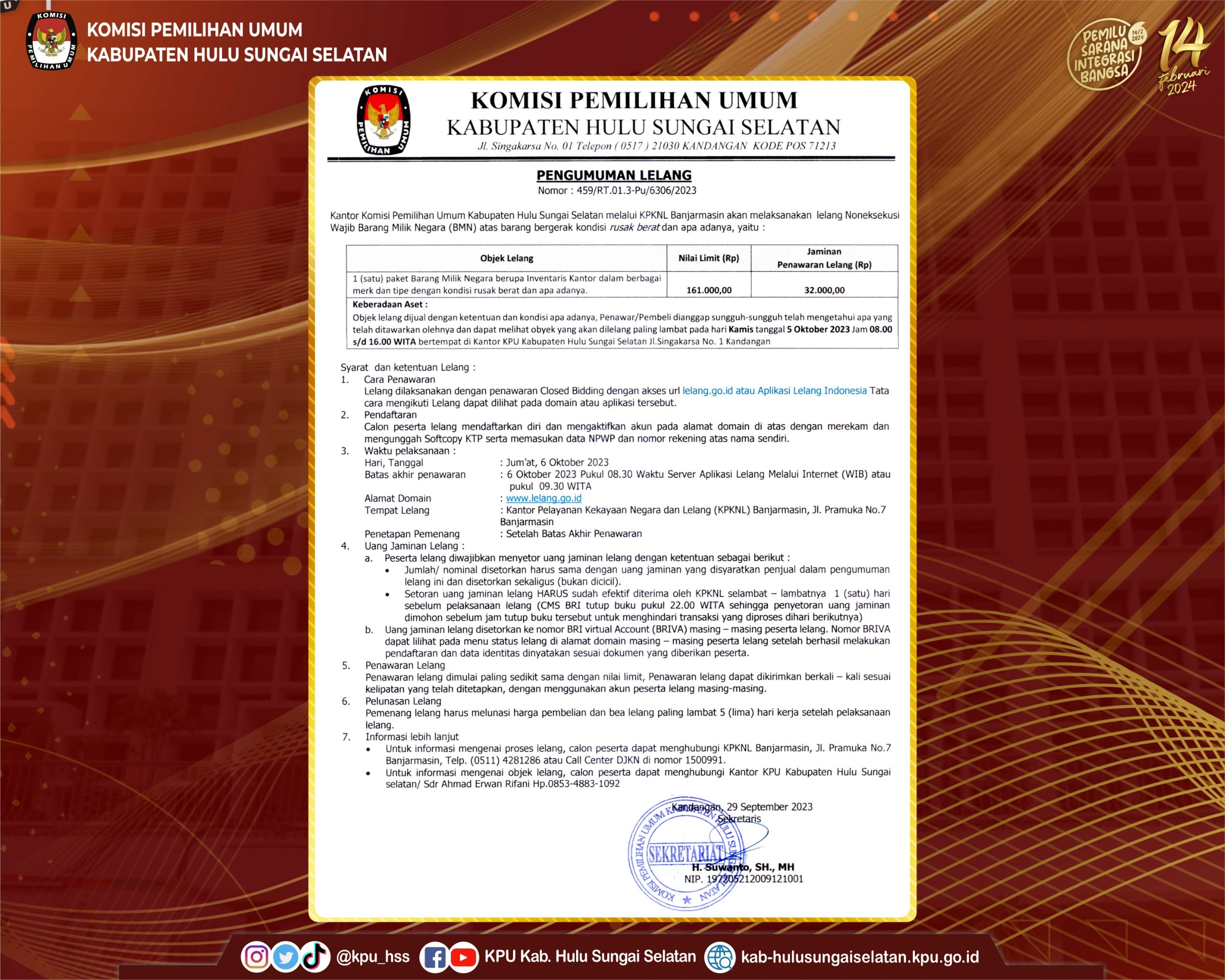 Berdasarkan Berita Acara Kesepakatan Bersama Antara Tim Anggaran Pemerintah Daerah Kabupaten Hulu Sungai Selatan Dengan Komisi Pemilihan Umum Kabupaten Hulu Sungai Selatan Nomor 415.4/14/BAK/KB/PEM/HSS/2023 dan Nomor 109/PP.01.2- BA/6306/2023 Tentang Alokasi Dana Kegiatan Pemilihan Bupati dan Wakil Bupati Hulu Sungai Selatan Tahun 2024, disepakati bahwa Pemerintah Kabupaten Hulu Sungai Selatan menganggarkan besaran anggaran kegiatan Pemilihan Bupati dan Wakil Bupati Hulu Sungai Selatan Tahun 2024 sebesar Rp 36.853.000.000 Penyediaan dana hibah kegiatan Pemilihan Bupati dan Wakil Bupati Hulu Sungai Selatan Tahun 2024 dianggarkan pada Tahun Anggaran 2023 sebesar 40% dan Tahun Anggaran 2024 dianggarkan sebesar 60% sesuai Surat Edaran Menteri Dalam Negeri Nomor 900.1.9.1/435/SJ Tentang Pendanaan Kegiatan Pemilihan Gubernur dan Wakil Gubernur, Bupati dan Wakil Bupati serta Walikota dan Wakil Walikota Tahun 2024.