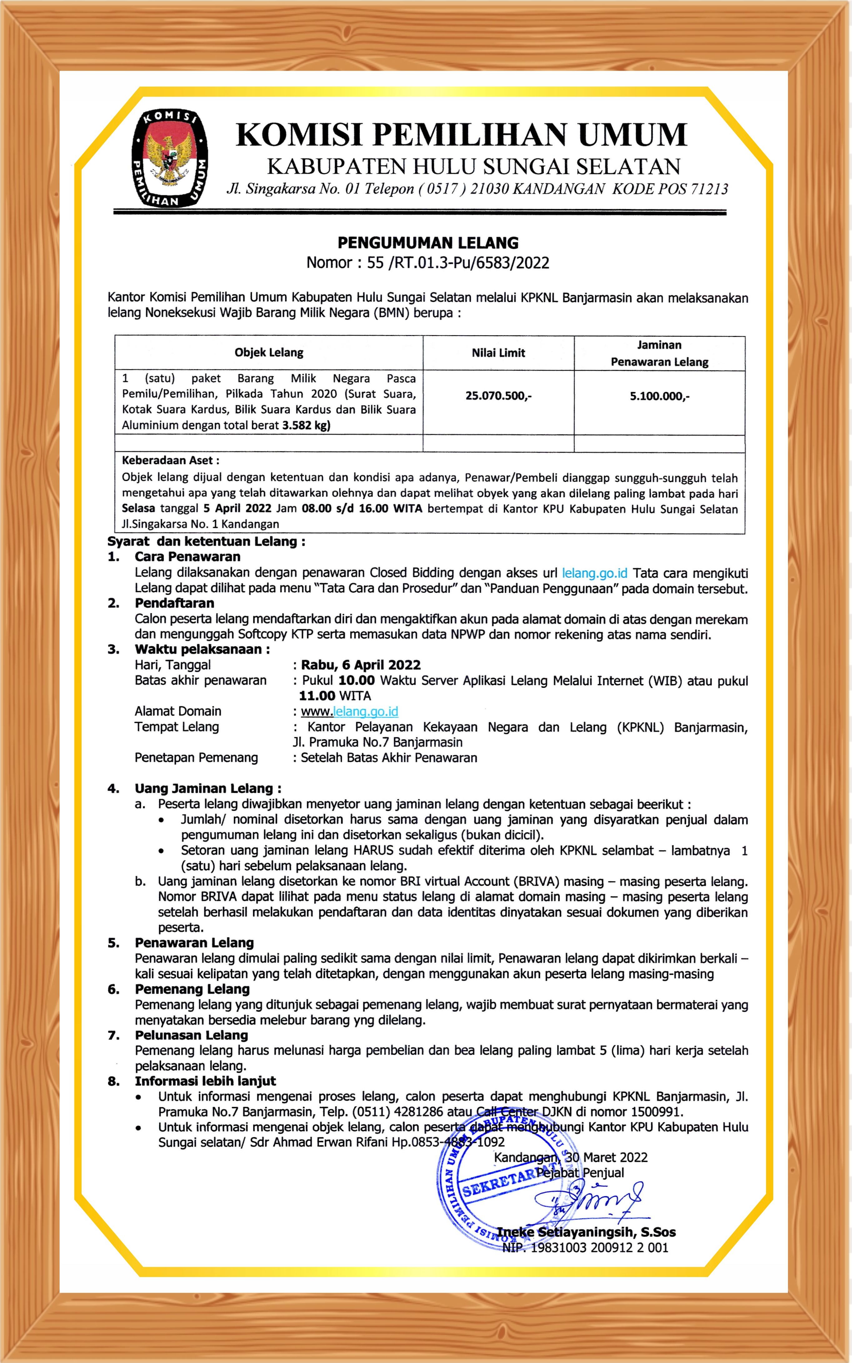 Pengumuman Lelang Non eksekusi BMN KPU Kabupaten Hulu Sungai Selatan 2022